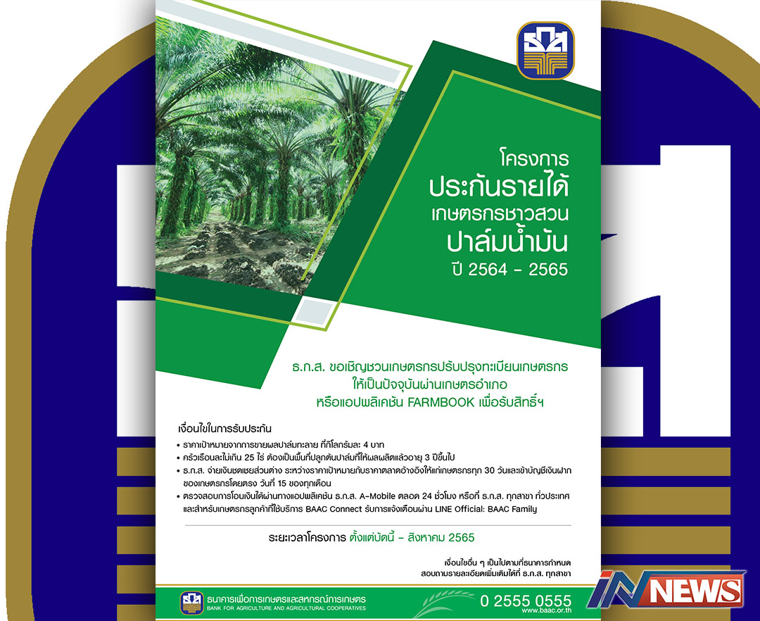 กรุงเทพฯ-ธ.ก.ส. เดินหน้าโครงการประกันรายได้เกษตรกรชาวสวนปาล์มน้ำมัน ปี 2564 - 2565 กำหนดราคาเป้าหมายจากการขายผลปาล์มทะลา...
