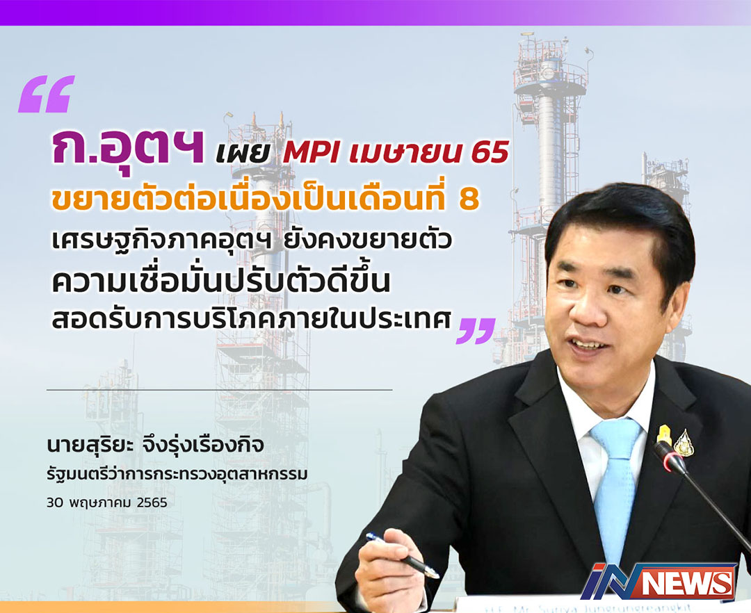 กรุงเทพฯ-กระทรวงอุตสาหกรรม (อก.) เผยดัชนีผลผลิตอุตสาหกรรม (MPI) เดือนเมษายน 2565 ขยายตัวเพิ่มขึ้นที่ร้อยละ 0...
