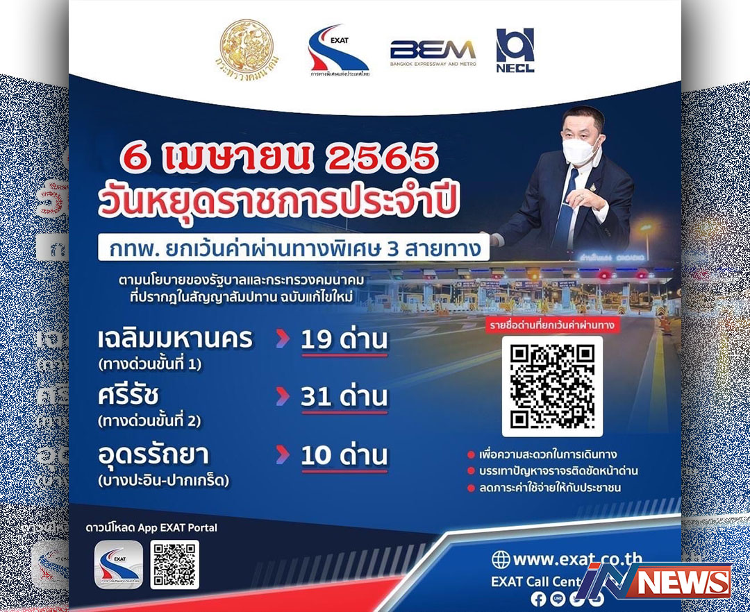 กรุงเทพฯ-การทางพิเศษแห่งประเทศไทย ยกเว้นค่าผ่านทางพิเศษ 3 สายทาง ในวันจักรีที่ 6 เมษายน 2565 างพิเศษเฉลิมมหานคร (ทา...