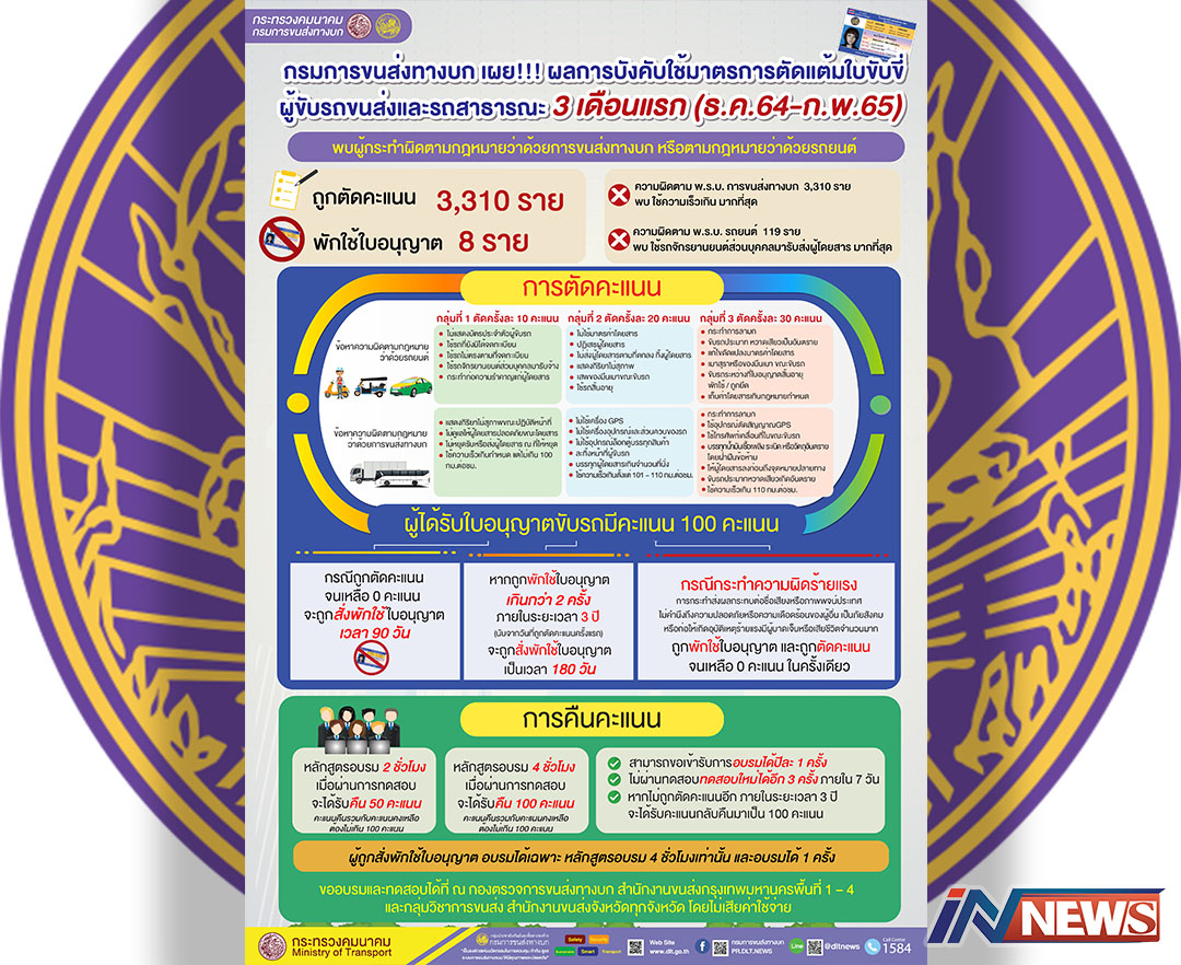 กรุงเทพฯ-กรมการขนส่งทางบกเปิดเผยผลการบังคับใช้มาตรการตัดแต้มใบขับขี่ผู้ขับรถขนส่งและ รถสาธารณะ 3 เดือนแรก (ธันวาคม 2564 ...