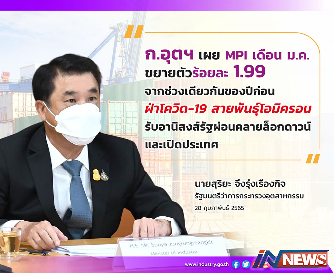 ก.อุตฯเผยMPIเดือนม.ค.ขยายตัว1.99% รับอานิสงส์คลายล็อกดาวน์-เปิดประเทศ