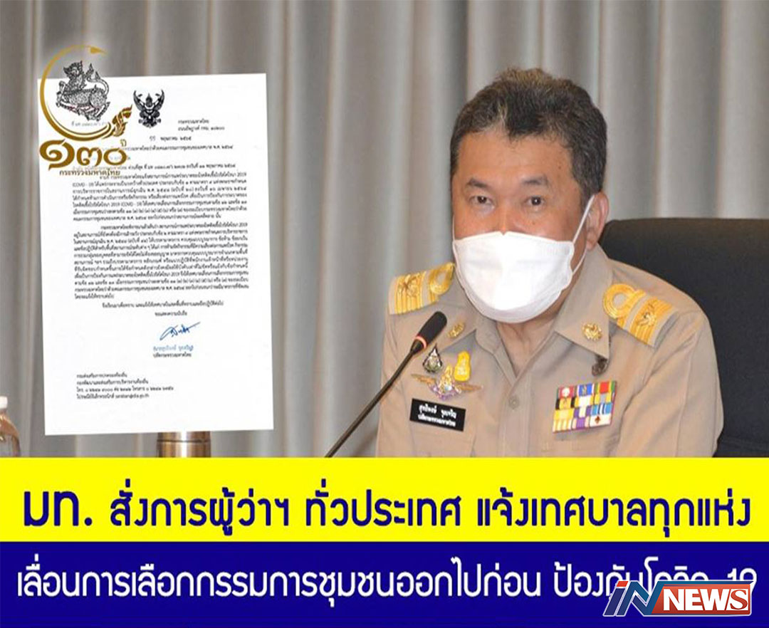 กรุงเทพฯ-มท. สั่งการผู้ว่าฯ ทั่วประเทศ แจ้งเทศบาลทุกแห่งเลื่อนการเลือกกรรมการชุมชนออกไปก่อน เพื่อป้องกันการแพร่ระบาดของโ...