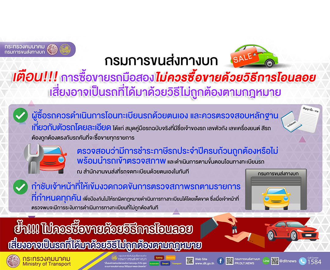 ขนส่งทางบกเตือนโอนลอยซื้อขายรถมือ2 เสี่ยงอาจเป็นรถที่ได้มาด้วยผิดกม.