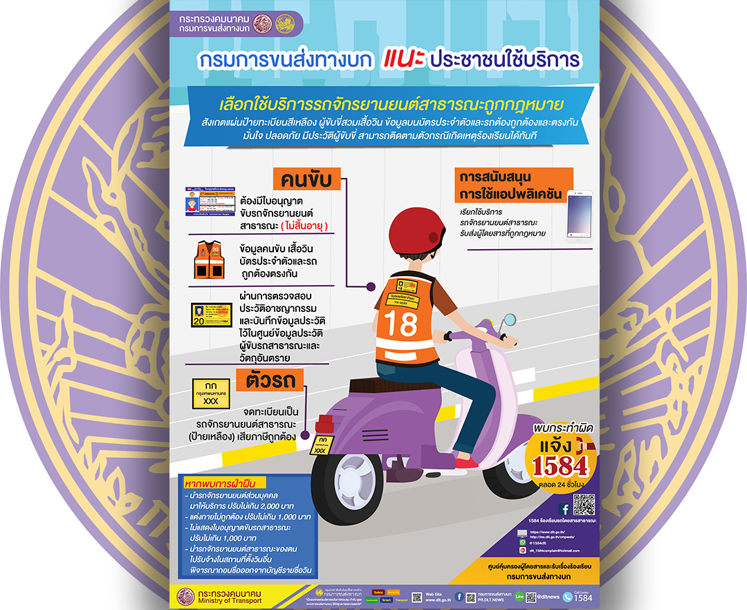 กรุงเทพฯกรมการขนส่งทางบก แนะนำเลือกใช้บริการรถจักรยานยนต์สาธารณะถูกกฎหมาย สังเกตแผ่นป้ายทะเบียนสีเหลือง ผู้ขับขี่สวมเสื้...