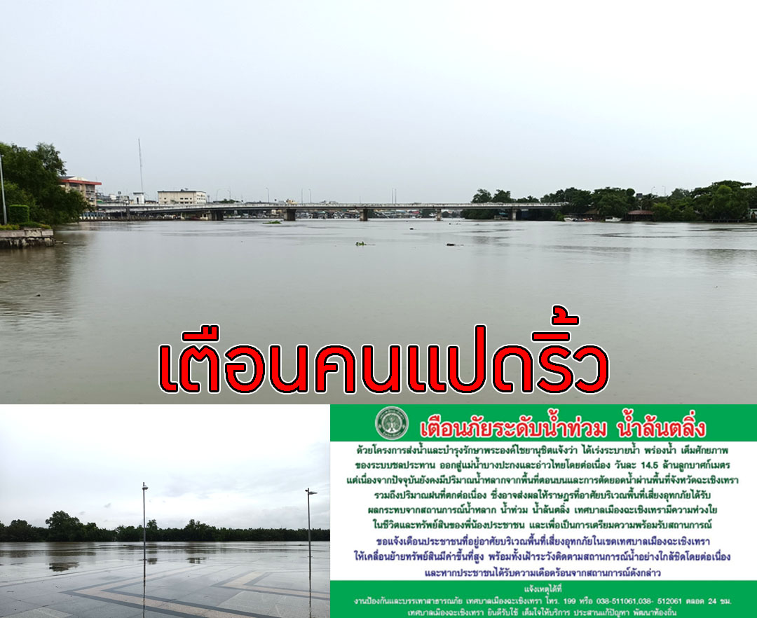 เตือนคนแปดริ้ว พักอาศัยใกล้ริมตลิ่งแม่น้ำบางปะกงเก็บของขึ้นที่สูง หลังกรมชลประทานเตรียมปล่อยน้ำเหนือผ่านพื้นที่ทิ้งลงทะเ...