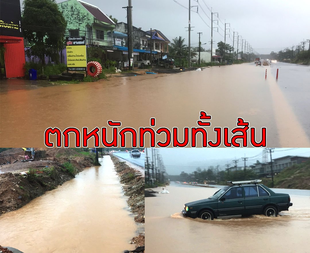 ฝนตกหนักน้ำไหลท่วมถนนเพชรเกษม สายตะกั่วป่าเขาหลักจมบาดาล