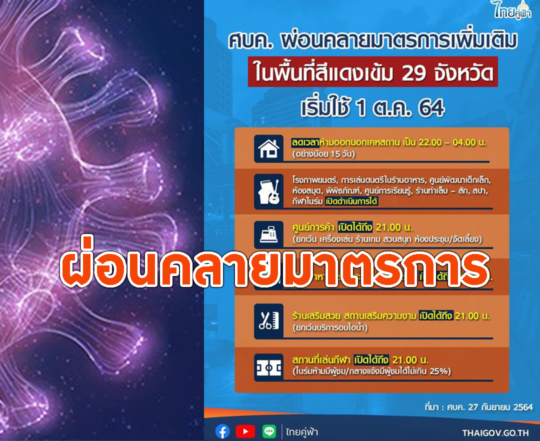 ศบค.ผ่อนคลายมาตรการพื้นที่สีแดง29จ. เคอร์ฟิว4ทุ่มถึงตี4เริ่ม1ต.ค.นี้