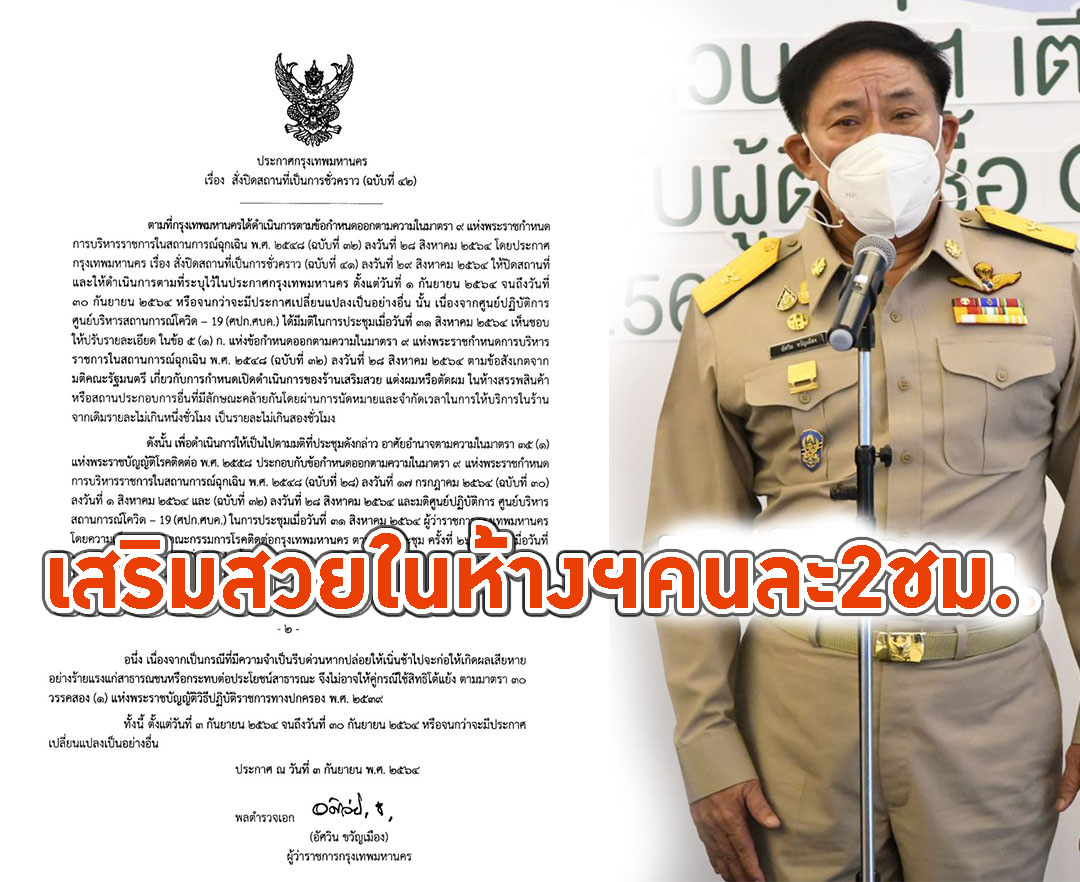 กรุงเทพฯ-ผู้ว่าราชการกรุงเทพมหานคร ได้ออกประกาศกทม. เรื่อง สั่งปิดสถานที่เป็นการชั่วคราว (ฉบับที่ 42) ปรับเวลาร้านเสริมส...