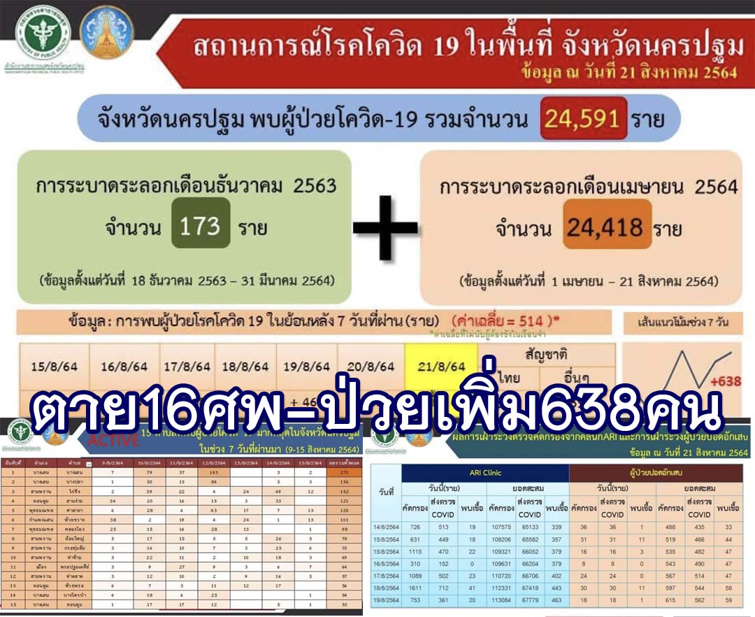 นครปฐม-พบคลัสเตอร์ 3 อำเภอยอดเดินหน้าผู้ป่วยรายใหม่พุ่งขึ้นอีก 638 รายเสียชีวิต 16 รายผู้ป่วยสะสมรวม 24,591 ราย