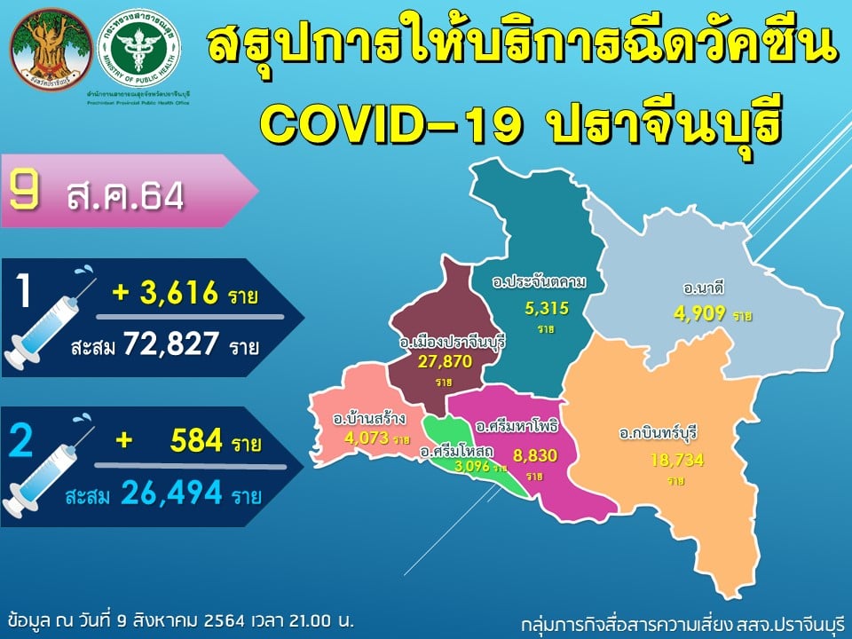 ปราจีนฯระดับฉีดวัคซีนแล้ว7.85หมื่นคน ขณะที่พบผู้ป่วยโควิดวันนี้100คน
