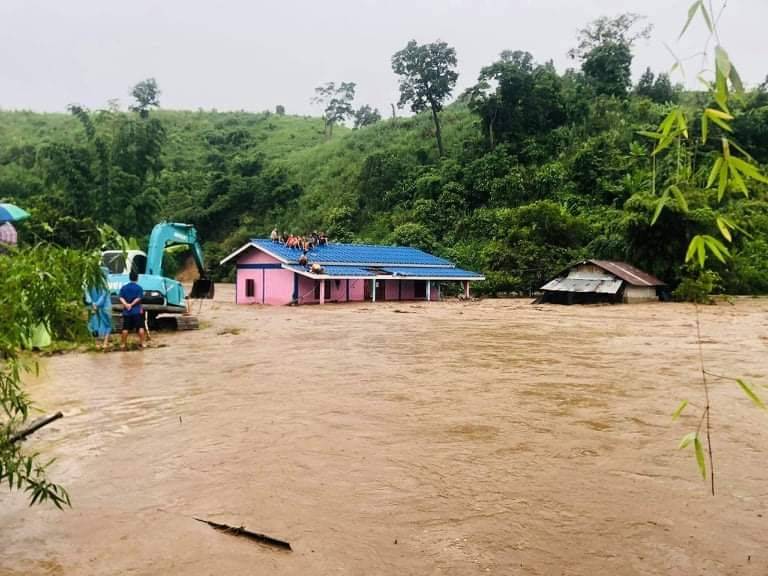 ชาวเขาหนีน้ำป่าขึ้นบนหลังคาลงไม่ได้ ต้องเอารถแบคโฮไปช่วยรับลงมา