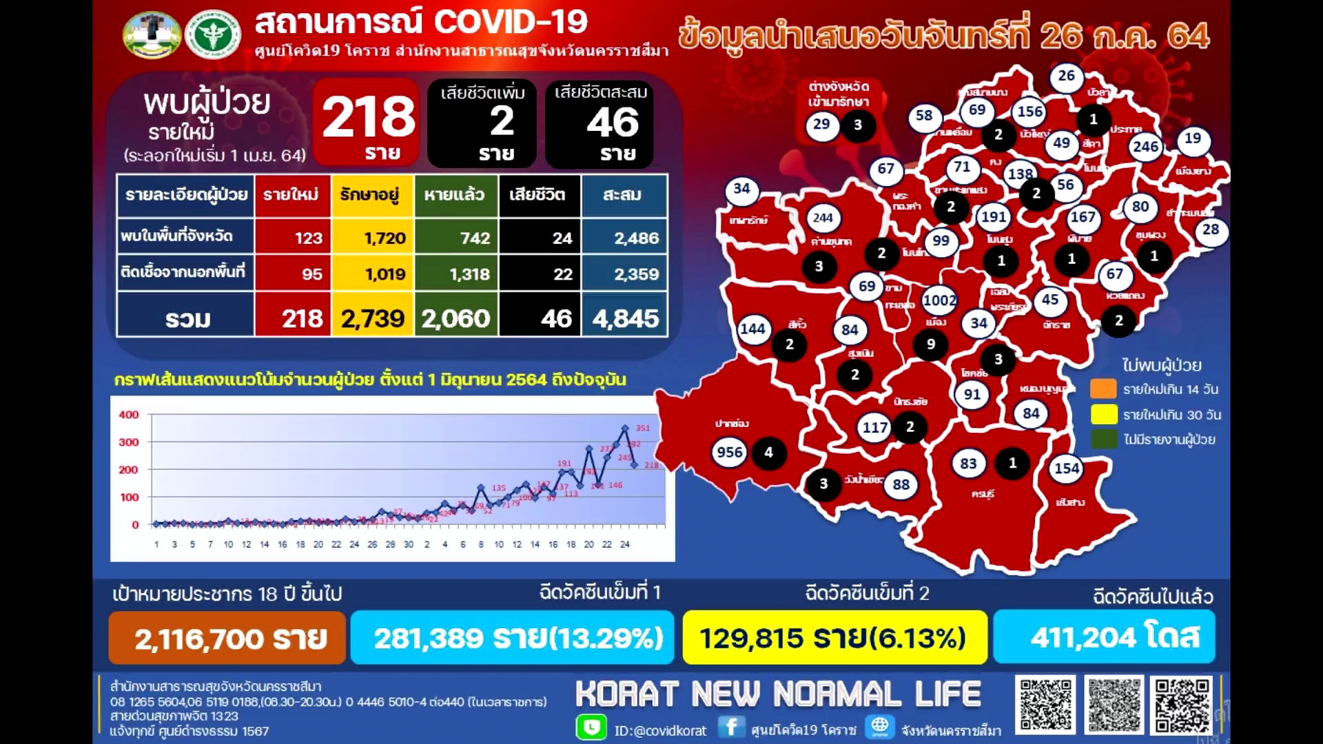 โควิดโคราชยังพุ่งต่อวันนี้เพิ่มอีก218ราย รพ.มหาราชประกาศหยุดฉีดวัคซีน