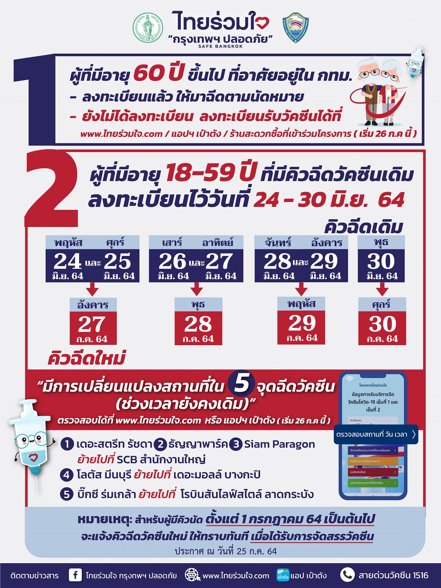 กรุงเทพฯ - "ไทยร่วมใจ"อัพเดทการฉีดวัคซีนผู้ลงทะเบียนจองตั้งแต่วันที่24-30มิถุนายน 2564 กำหนดฉีดตามลำดับและมีกา...