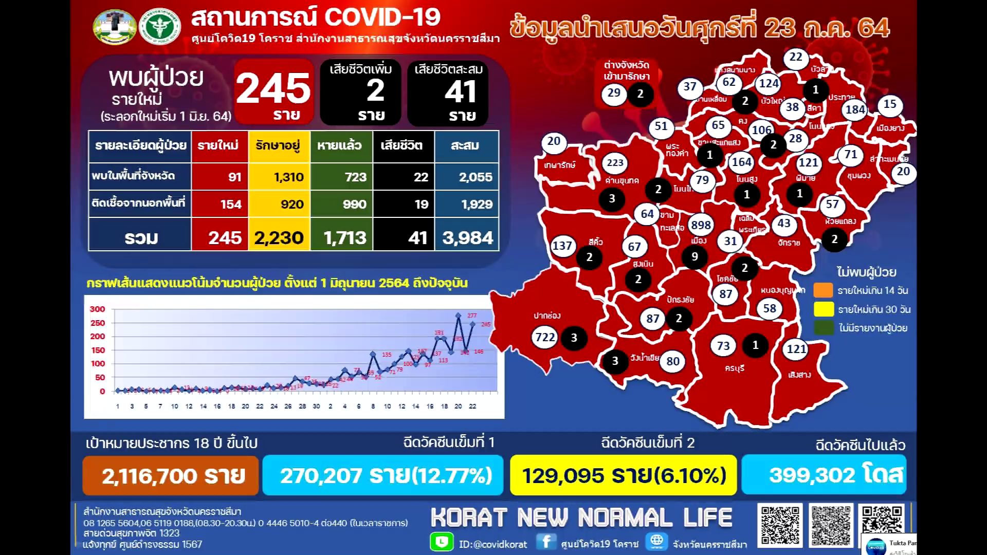 โควิดโคราชยังพุ่งต่อวันนี้เพิ่มอีก245ราย เร่งสกัด2คลัสเตอร์แคมป์-ตลาดสด