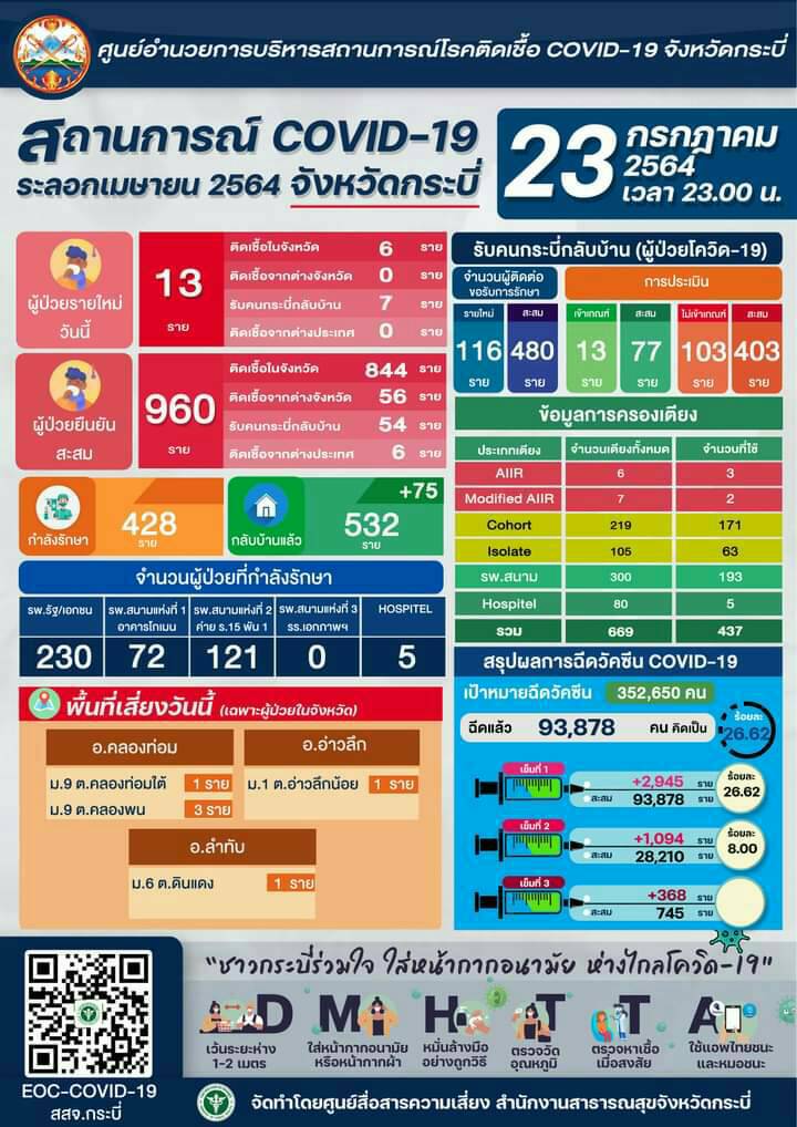 กระบี่-ตาย 2 ป่วยโควิด-19 ป่วยรายวันติดเพิ่ม 13 ราย ในพื้นที่ 6 รับกลับบ้าน 7