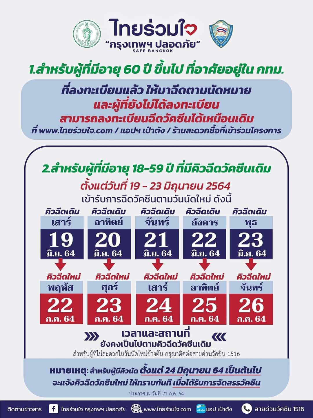 ข่าวดี!กทม.เผยผู้จองฉีดวัคซีน19-23มิ.ย. ให้ไปฉีด22-26ก.ค.นี้