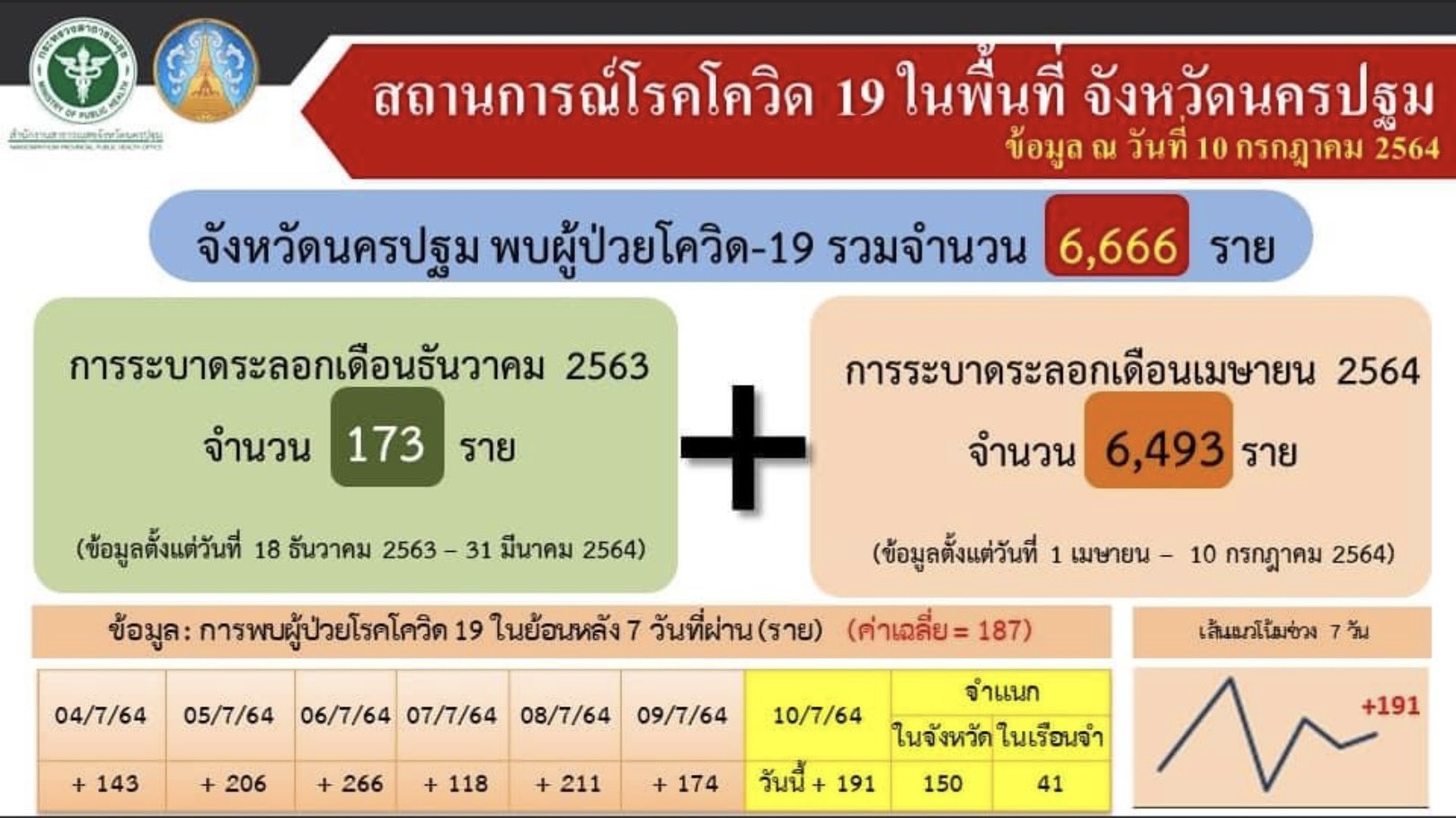 นครปฐม-พบผู้ป่วยรายใหม่พุ่งขึ้นรายวันอีก 191 รายเสียชีวิต 6 รายผู้ป่วยสะสม 6,666 รายในเรือนจำกลางนครปฐม 41 ราย