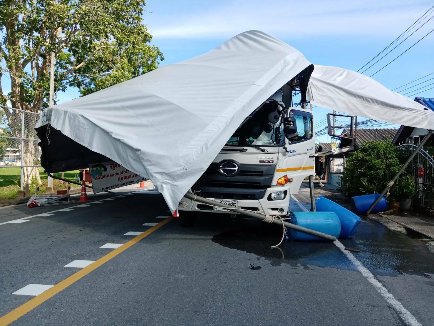 พังงา-แตกกระเจิงรถบรรทุกสินค้าชนด่านตรวจโควิด-19 ตลาดกระโสม เจ้าหน้าที่เจ็บหลายราย