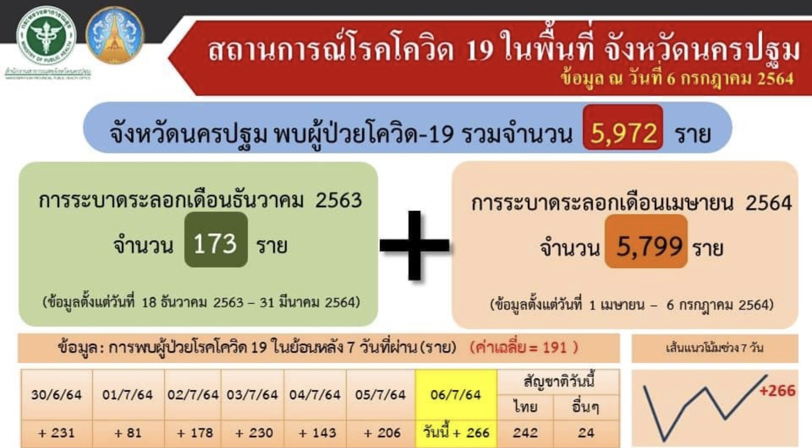 นครปฐม-ยอดผู้ป่วยติดเชื้อจังหวัดนครปฐมเดินหน้าต่อเนื่อง วันนี้เพิ่มอีก 266 ราย โดยอำเภอสามพรานยอดเพิ่มวันเดียวร้อยกว่าคน...