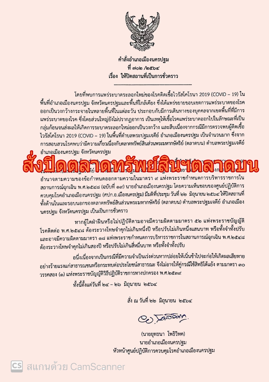 นครปฐม-ประกาศปิดตลาดทรัพย์สินส่วนพระมหากษัตริย์-ตลาดบน ในวันที่ 24-26 มิถุนายน 2564