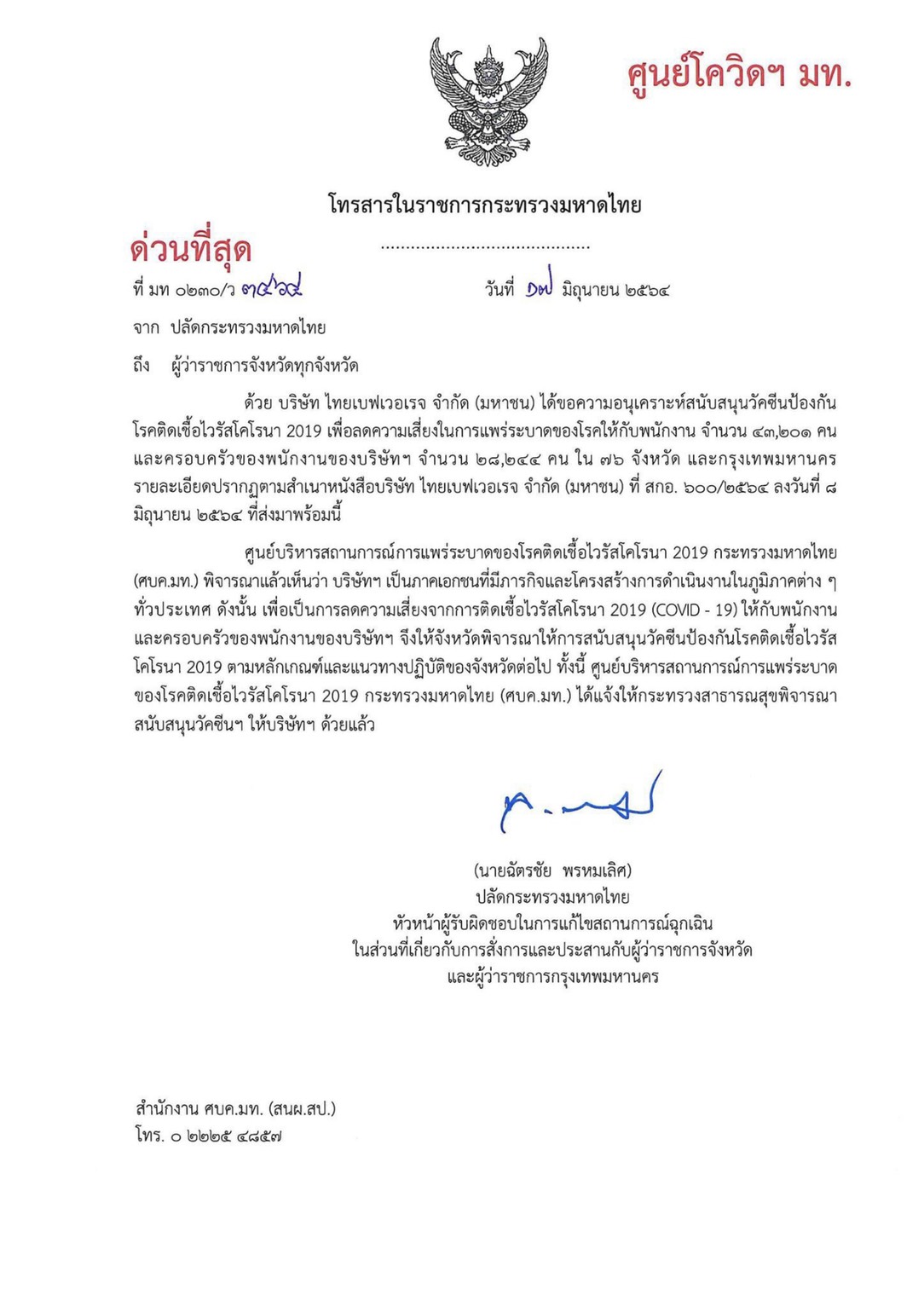 มหาดไทยทำจดหายถึงทุกจังหวัดให้จัดสรรวัคซีนให้กับพนักงานและเครือญาติของบริษัทหนึ่งได้รับบริการฉีดวัคซีนนอกเหนือจากการให้บ...