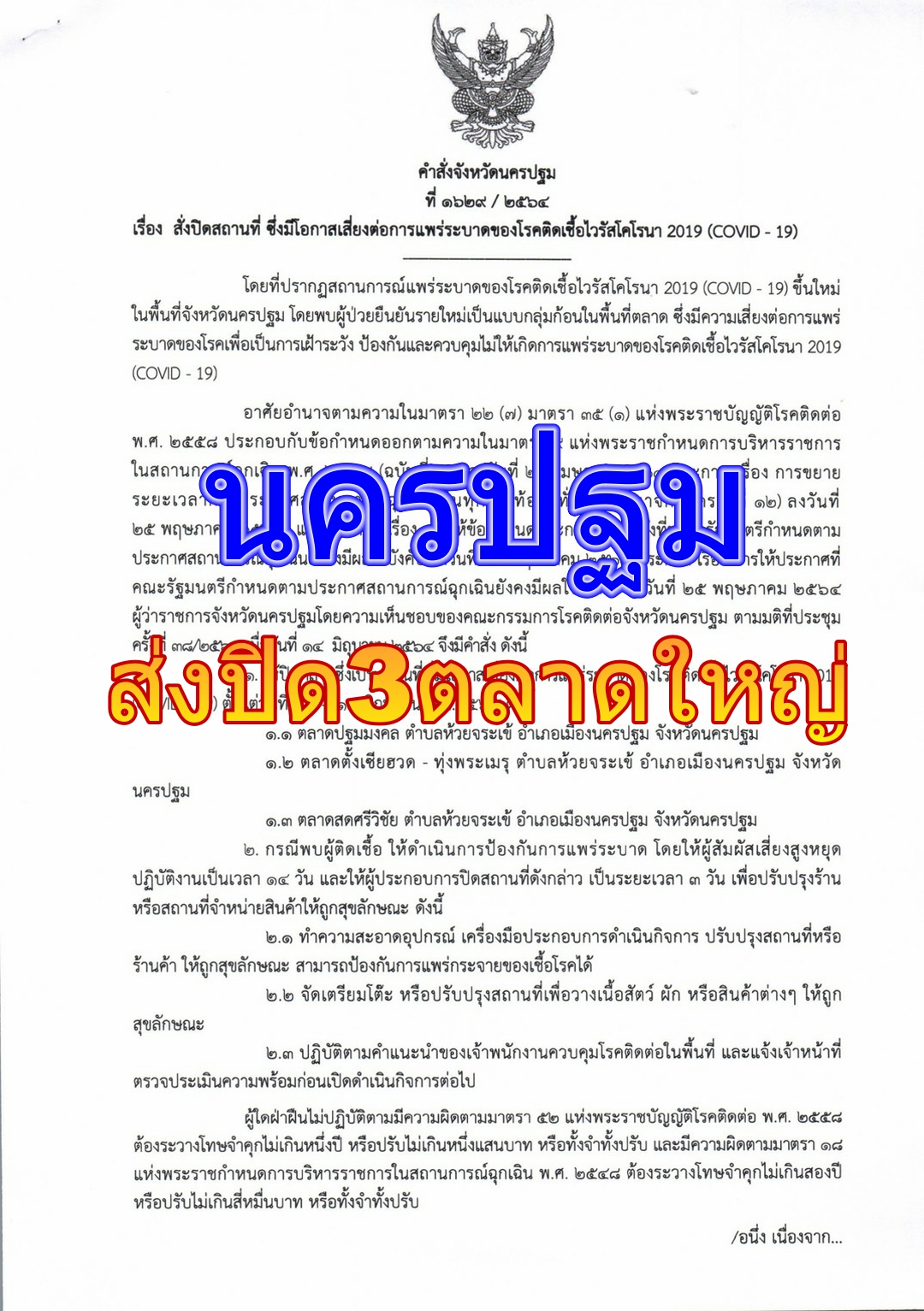นครปฐม-จังหวัดนครปฐม คำสั่ง ฉ.1629/2564 (ลวท.14 มิถุนายน 2564 ) เรื่อง สั่งปิดสถานที่ซึ่งมีโอกาส เสี่ยงต่อการแพร่ระบาดขอ...