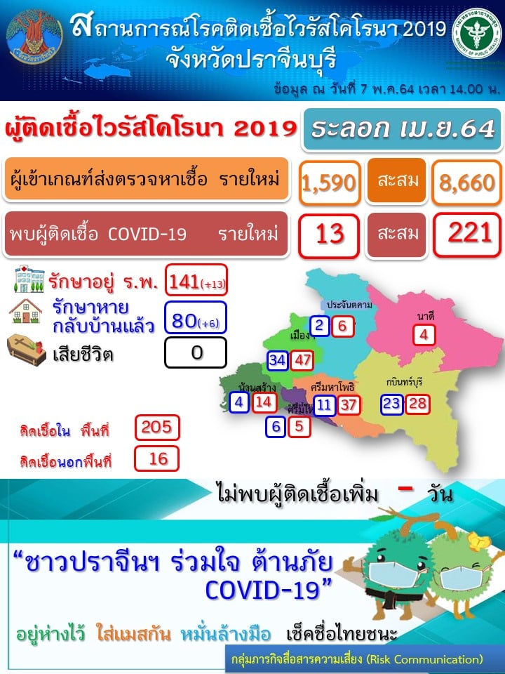 ปราจีนฯยังหนักพบผู้ติดโควิดวันนี้13ราย คลัสเตอร์หมอทหารน่าห่วง