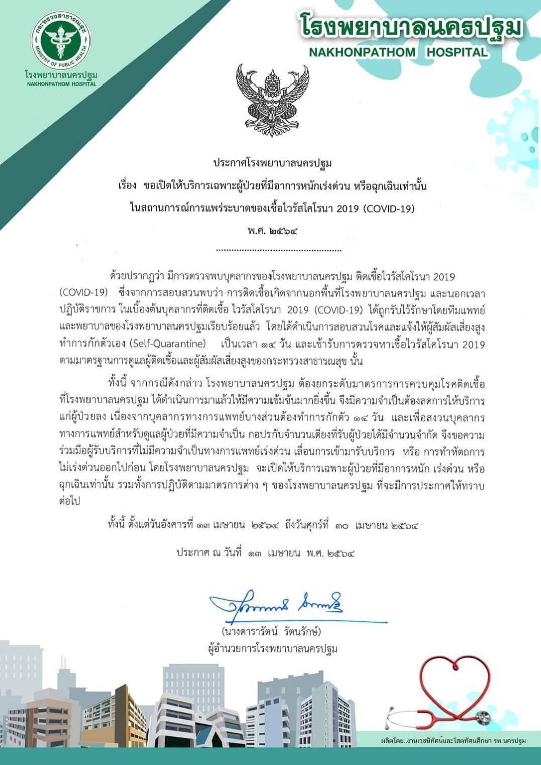 นครปฐม-ประกาศโรงพยาบาลนครปฐมขอเปิดให้บริการเฉพาะผู้ป่วยที่มีอาการหนักเร่งด่วนหรือฉุกเฉินเท่านั้นในสถานการณ์การแพร่ระบาดข...
