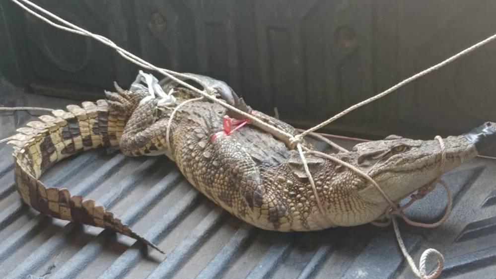 ปราจีนบุรี-ผวาไอ้เข้บุกถึงหน้าห้องนอนกลางดึก พบจระเข้ขนาดยาว 1.40 ม.หนักประมาณ40 กก. คลา...