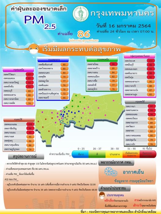 กรุงเทพฯ-กทม.อากาศเย็น แต่ค่าฝุ่นPM2.5วันนี้เกินมาตรฐาน ดูแลสุขภาพกันด้วย ไม่ควรทำกิจกรรมกลางแจ้ง เช่น วิ่งออกกำลังกายหร...