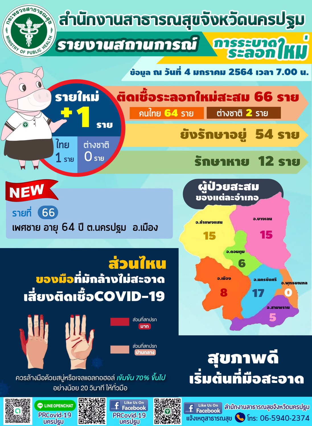 นครปฐม-สถานการณ์โควิด-19จังหวัดนครปฐม เผยข้อมูลผู้ติดเชื้อไวรัสโควิด-19 เพิ่มอีก 1 ราย รวมยอดสะสม 66 ราย กลับบ้านแล้ว 2 ...
