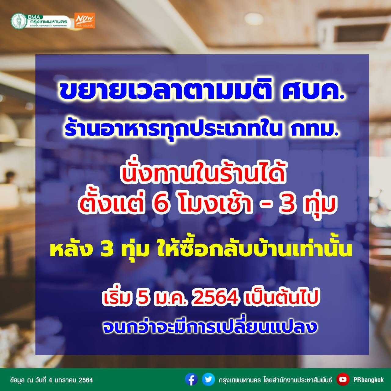 ศบค.กทม.เคาะเวลาเปิด-ปิดร้านอาหาร จำกัดนั่งกินได้6โมงเช้า-3ทุ่ม/ห้ามดื่มสุรา