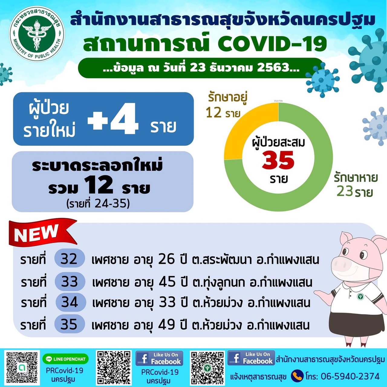 นครปฐม-ยืนยันนครปฐม ติดเชื้อเพิ่มอีก 4 ราย เป็นชาวอำเภอกำแพงแสน ยอดติดเชื้อระรอกใหม่ 12 ราย ยอดสะสม 35 ราย โดยพ่อเมืองออ...