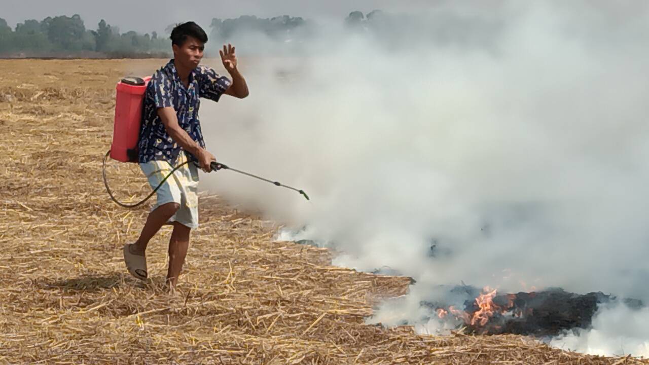 ชาวกบินทร์บุรีช่วยกันดับไฟไหม้ทุ่งนา หวั่นเกิดฝุ่นPM2.5