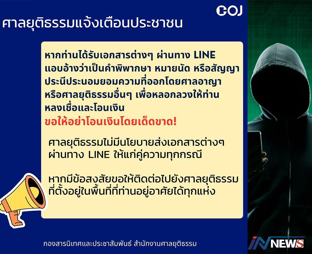 สนง.ศาลยธ.เตือนปชช.ให้ระวังมิจฉาชีพ อ้างหมายศาลปลอมส่งหลอกทางไลน์