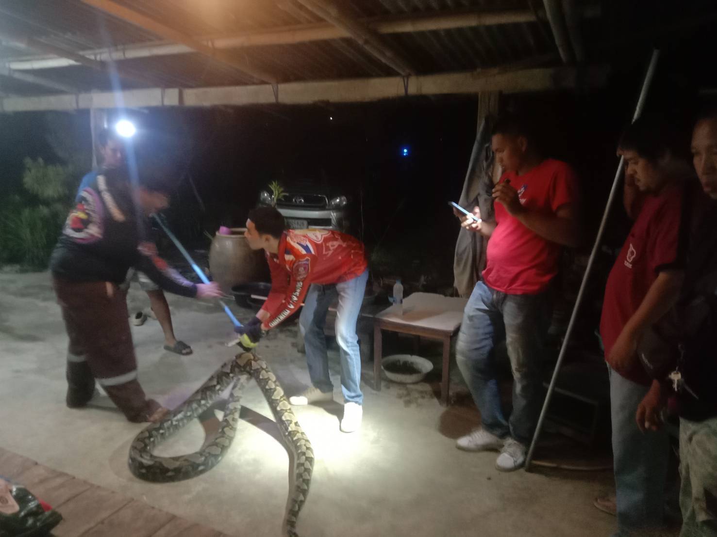 กู้ชีพนครปฐมชาวบ้านแจ้งจับงูเหลือมยักษ์ ยาวกว่า4เมตรคาดหนีน้ำท่วม