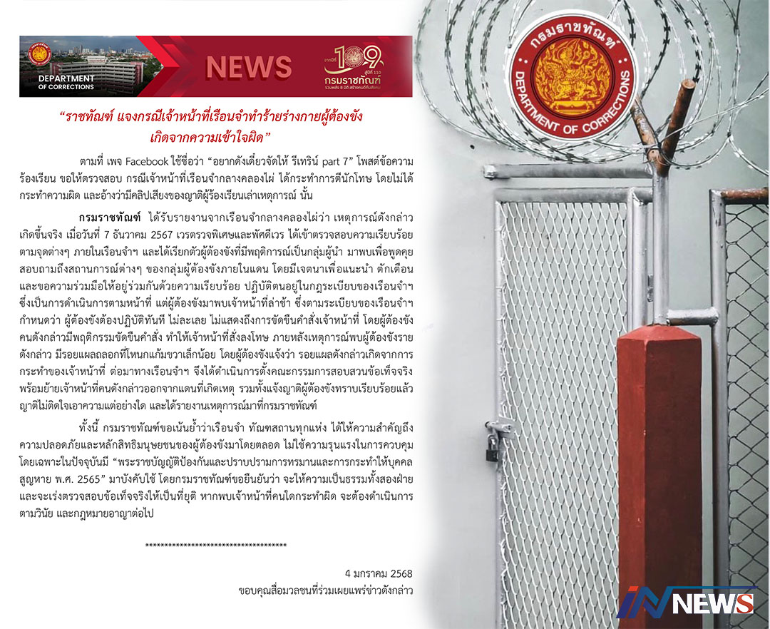 'ราชทัณฑ์'แจงกรณีผู้คุมทำร้ายผู้ต้องขัง ที่คุกคลองไผ่/ชี้เกิดจากความเข้าใจผิด
