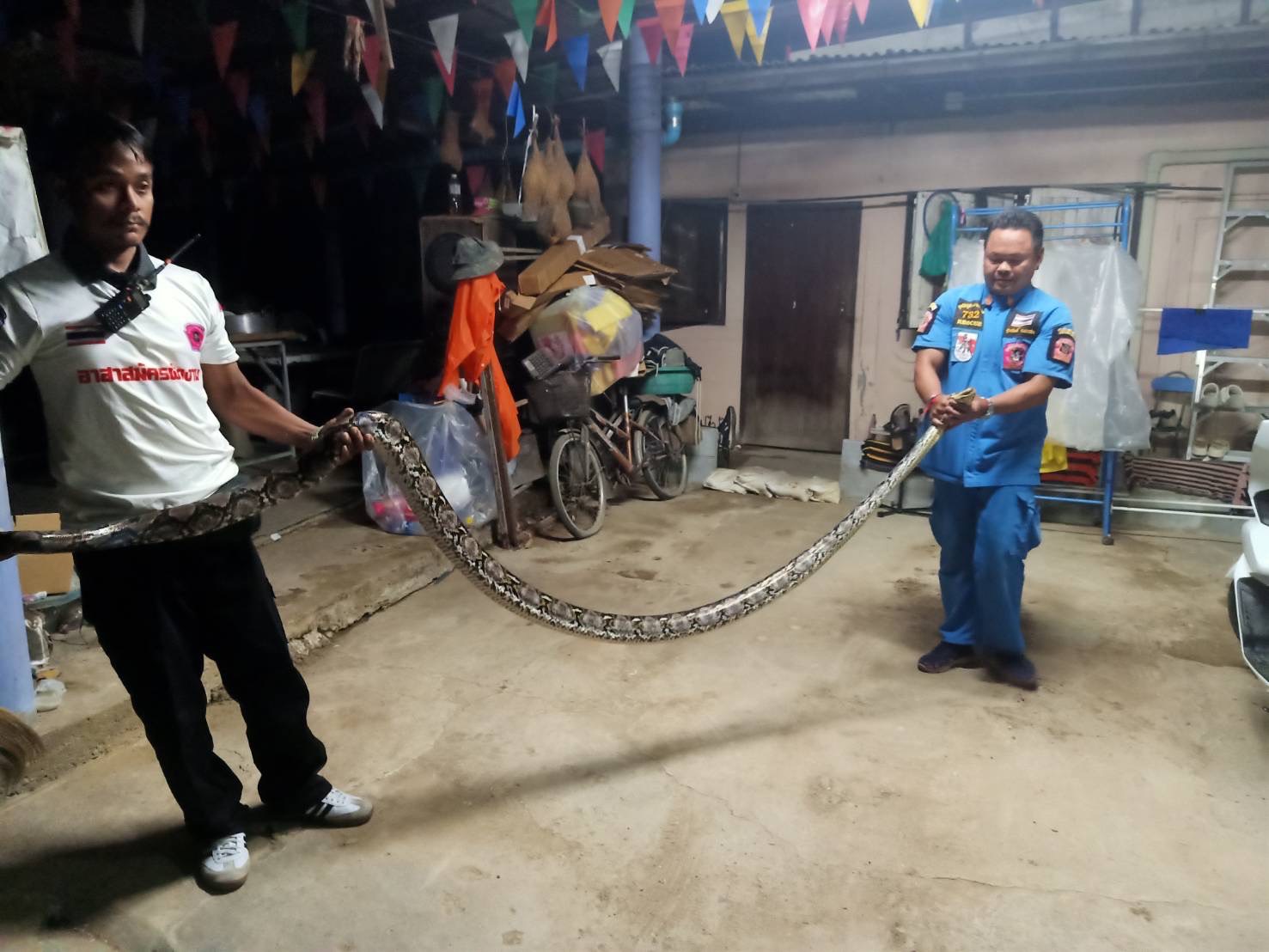 อาสาสมัครกู้ชีพเร่งช่วยจับงูเหลือมใหญ่ มานอนซุ่มรอแอบงาบแมวที่บ้าน