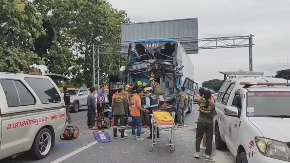 รถบัสชนรถบรรทุกข้าวเจ็บหนักหลายคน คนขับรถทัวร์หลับในพุ่งชนท้ายรถขนข้าว