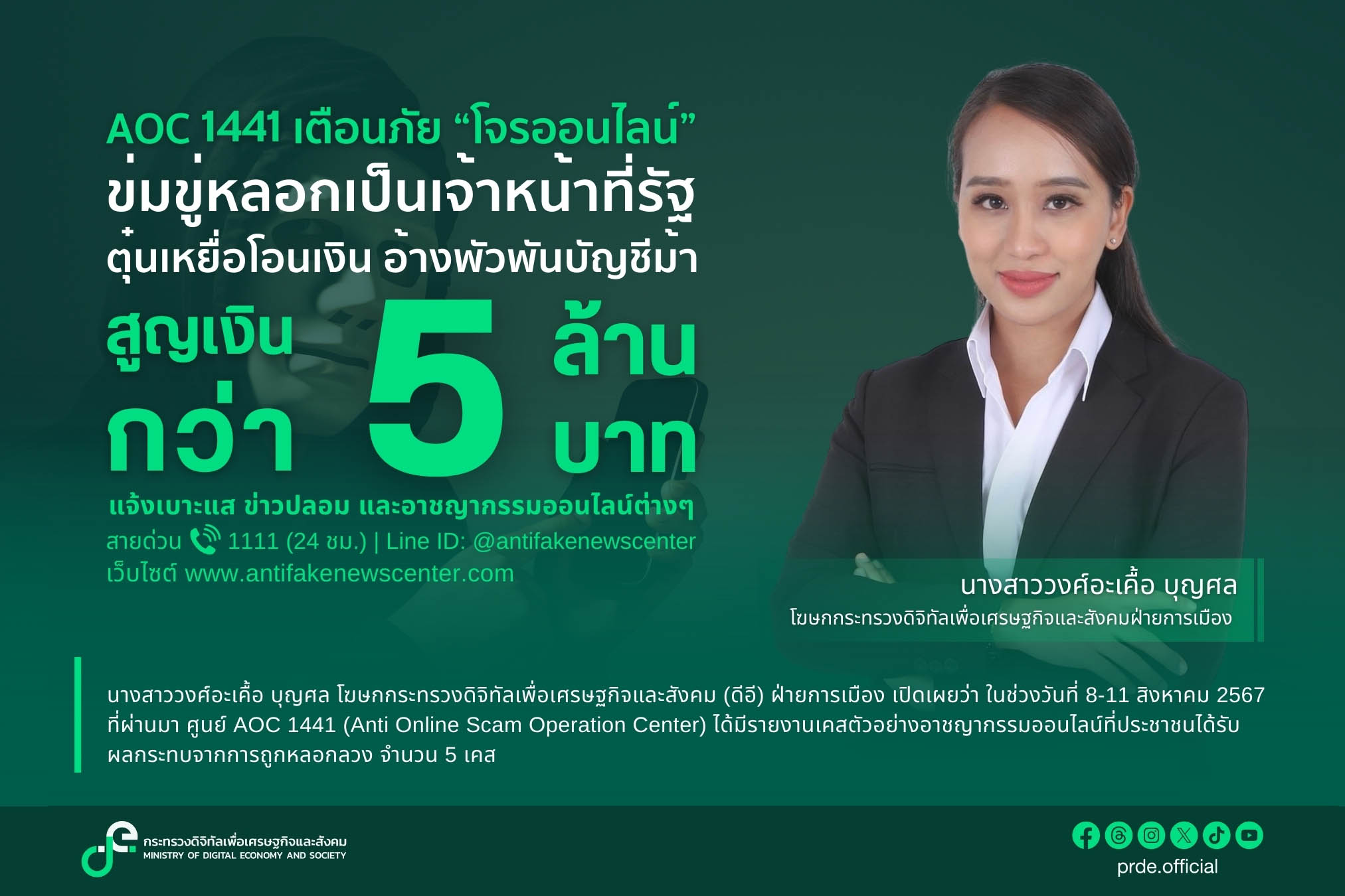 AOC1441เตือนภัย'โจรออนไลน์'ข่มขู่ อ้างเป็นจนท.รัฐตุ๋นเหยื่อโอนเงินกว่า5ลบ.