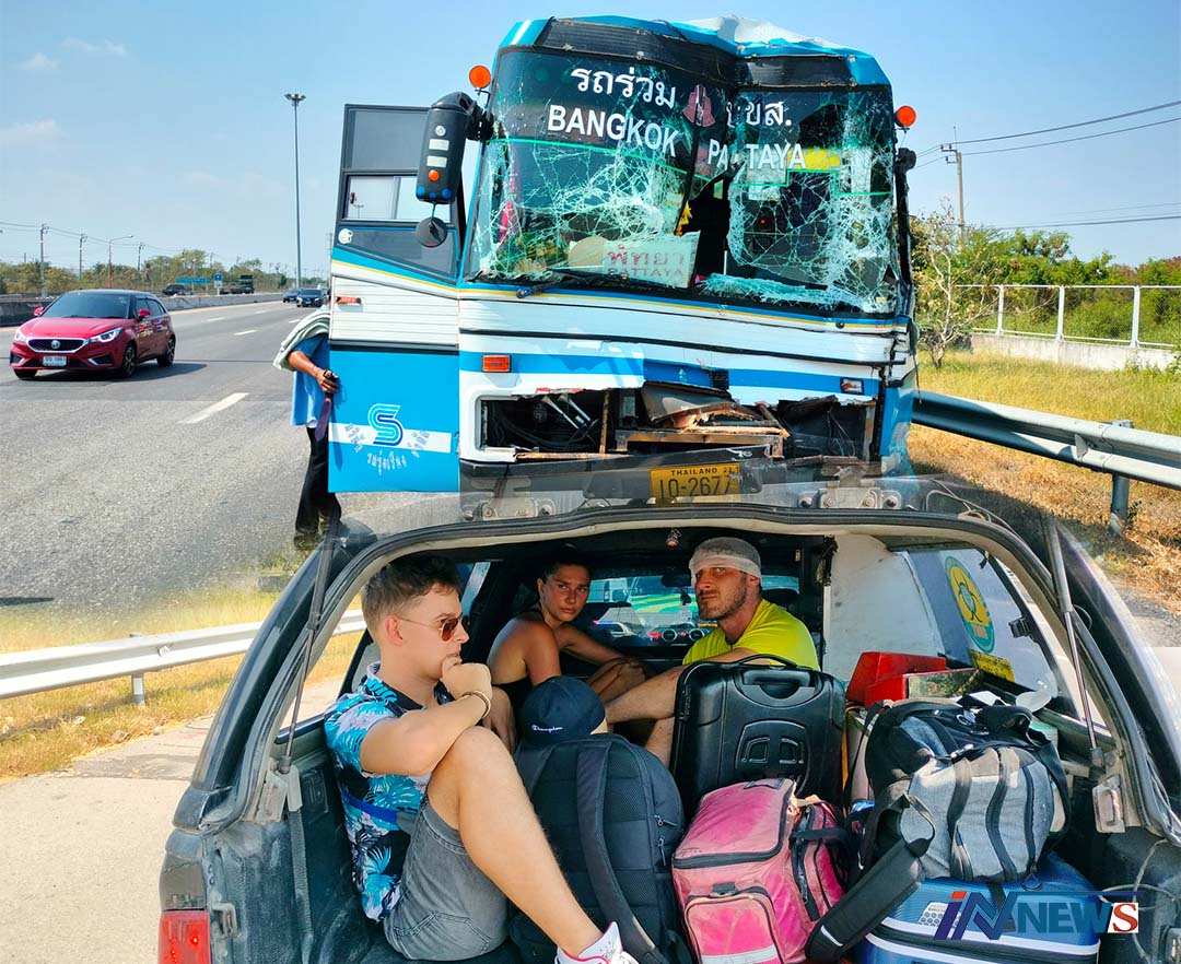 รถโดยสารกรุงเทพ-พัทยาขนส่งต่างชาติ เสยท้ายพ่วง18ล้อพลิกคว่ำเจ็บ22