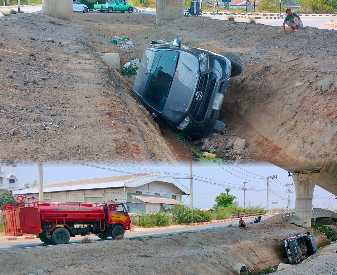 สาวขับปิ๊กอัพลื่นน้ำนองถนนพุ่งตกคลอง โชคดีพังแค่รถแต่คนปลอดภัย