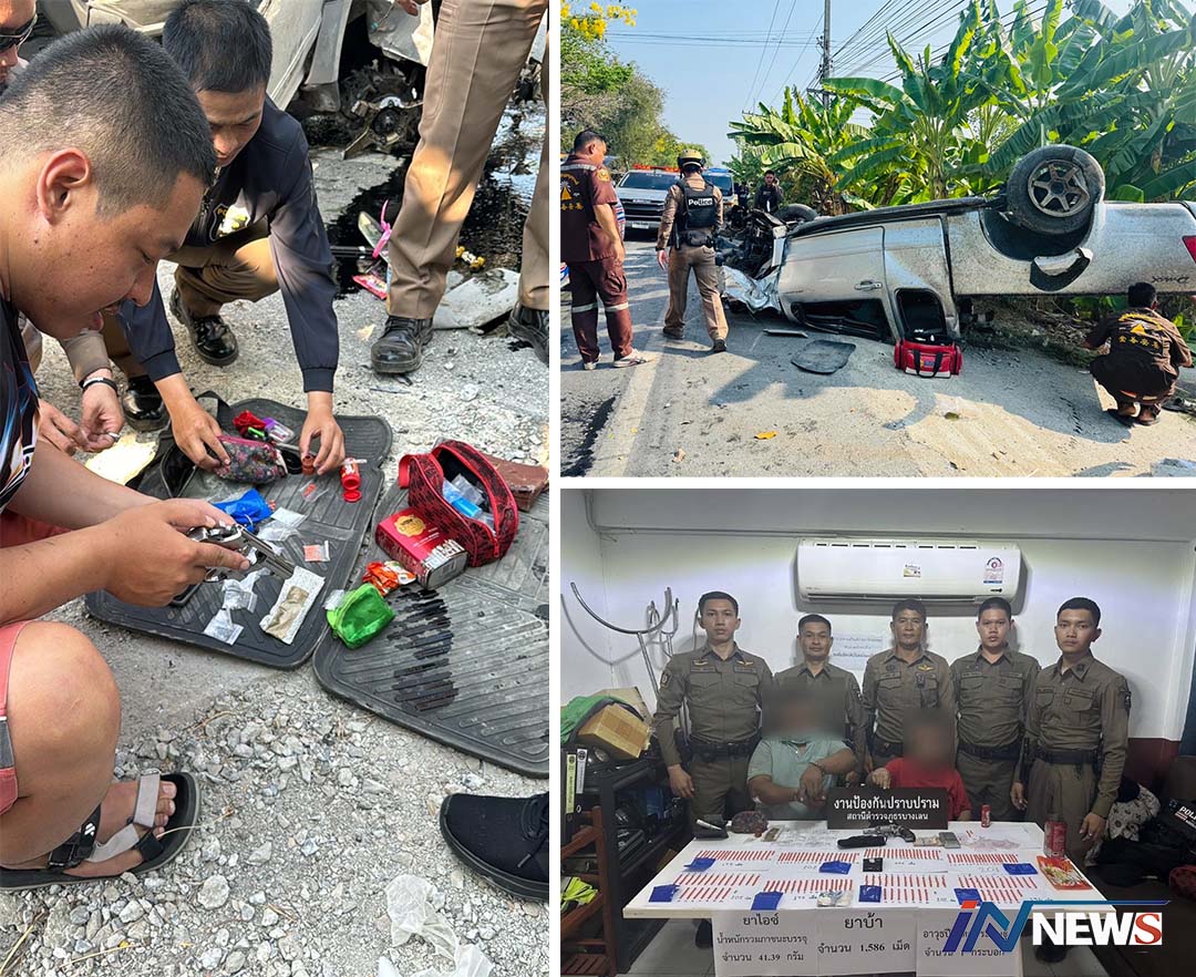 นครปฐม-สองสามีภรรยาจอดรถริมถนนเจอตำรวจสายตรวจเข้าตรวจค้นชิ่งรถหลบหนีพลิกคว่ำยาเสพติด ยาบ้า 1 พันกว่าม็ด ไอว์ กระเด็นตกพื...