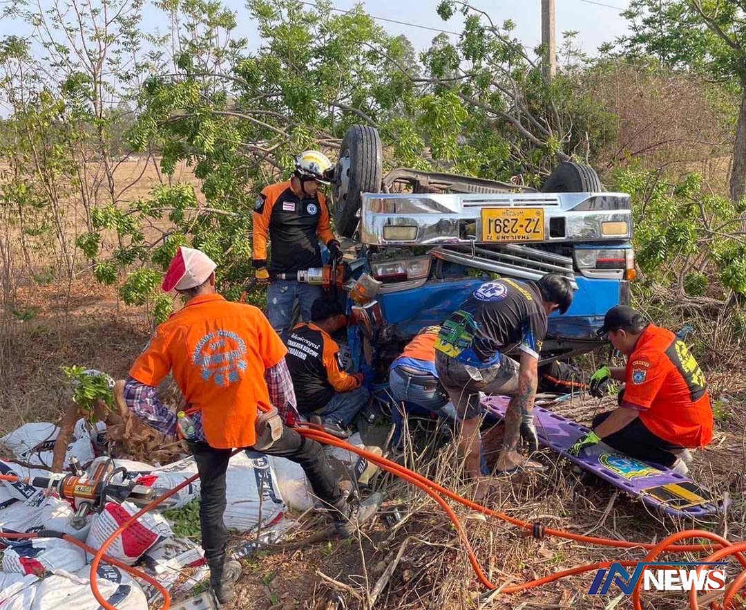 อนาถ!เผยรถบรรทุกอาหารสัตว์พลิกคว่ำ คาดหลับในส่งผลคนขับ-ลูกน้องดับทั้งคู่