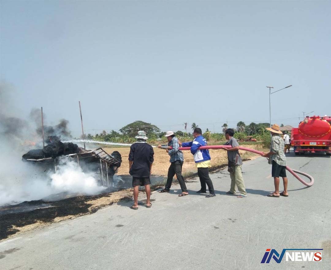 หวิดถูกย่างสด!!รถขนฟางเร่งเครื่องเกิด ประกายไฟเผาวอดทั้งคัน