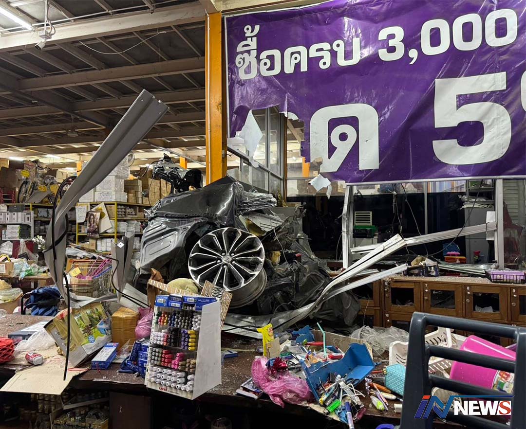เก๋งดำซิ่งแหกโค้งเหมาร้านขายส่ง20บาท พังยับโชคดีไม่มีผู้เสียชีวิต