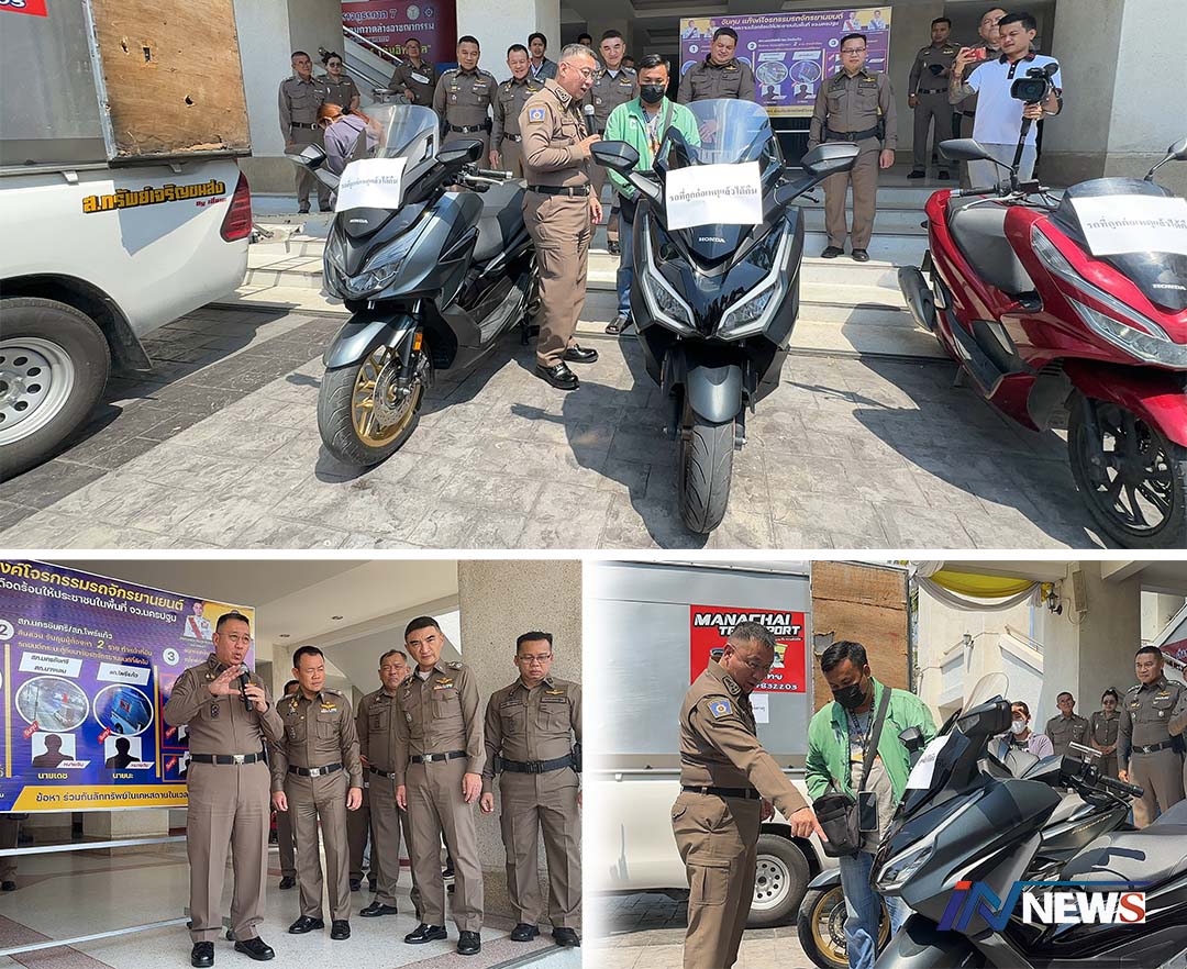 นครปฐม-ผู้บัญชาการตำรวจภูธรภาค 7 นำทีมแถลงผลการจับกุมคนร้ายที่ก่อเหตุลงมือโจรกรรมรถจักรยานยนต์ในพื้นที่จังหวัดนครปฐมและพ...