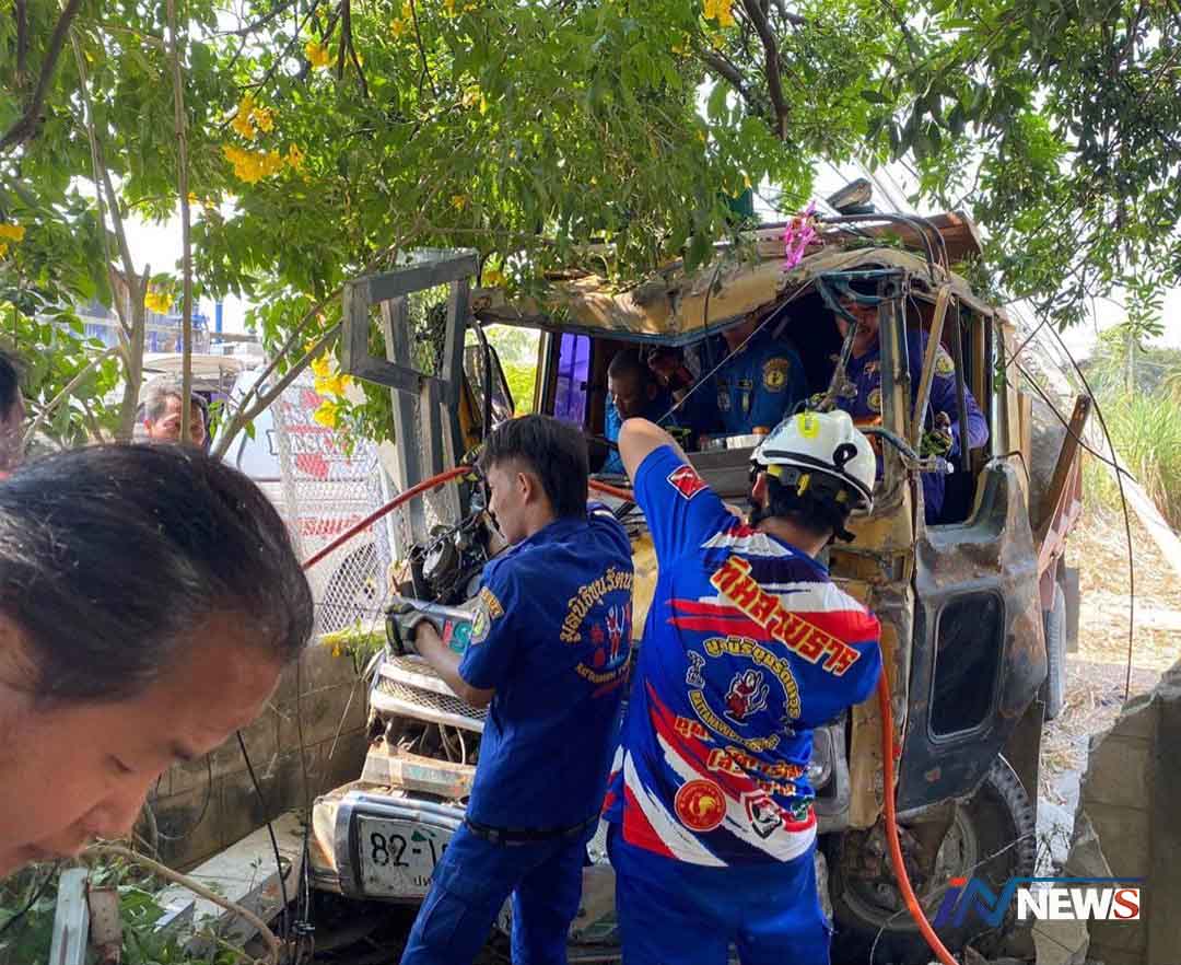นาทีชีวิต!กู้ภัยกาญจนบุรีใช้เครื่องตัดถ่าง ช่วยชีวิตคนขับรถบรรทุกชนเสาไฟฟ้า