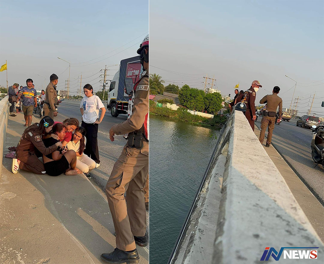 นครปฐม-ตำรวจบางเลน ใช้ไหวพริบเข้าร่วมตัว คว้าร่างหญิงเครียดจัดเตรียมกระโดดสะพานข้ามแม่น้ำท่าจีนได้ทันควัน ท่ามกลางความโล...