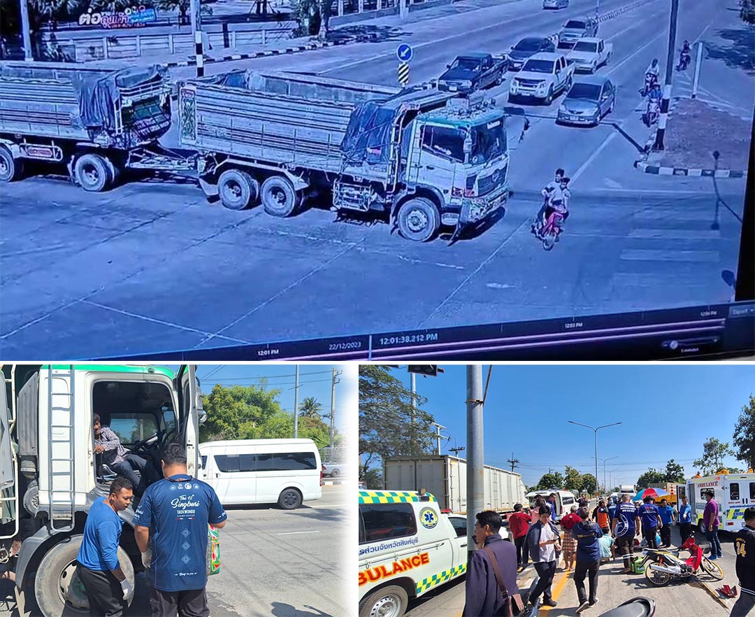 สิงห์บุรี -นาทีระทึก รถพ่วงฝ่าไฟแดงชนรถ จยย. เด็กเทคนิคฯ อย่างจัง ทำให้มีผู้เสียชีวิต 1 ราย บาดเจ็บสาหัส 2 ราย (มีคลิปจา...